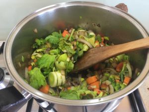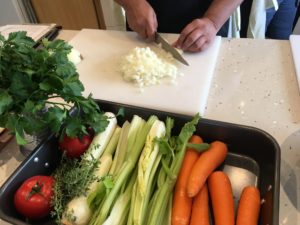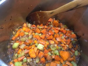 Remove the lamb necks, wipe the pan, and add more oil and butter to the pan. Add the onion and cook for 10 minutes until golden and caramelised, then carrot, celery and garlic; continue cooking, over medium heat, stirring occasionally, until nicely browned another 8 – 10 minutes.