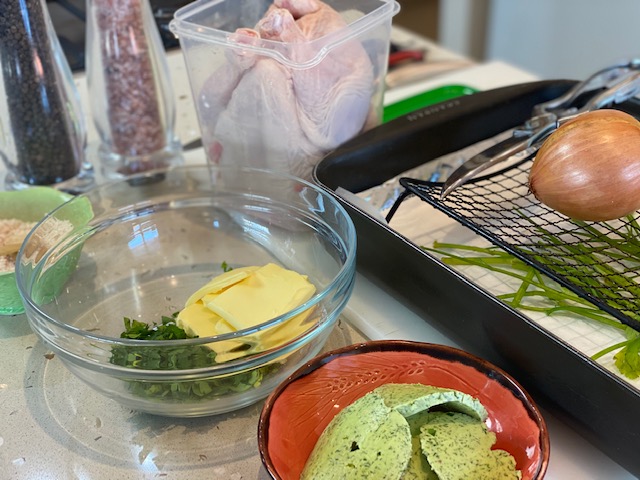 • a herbed butter mixture of thyme, parsley, garlic and pepper, possibly rosemary as well, placed under the breast skin.