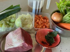The rule of thumb is to gently simmer the beef for 40 minutes per 500grams, although I always cook it for longer and let it rest in the broth.  If serving immediately, keep the meat warm by leaving it in the broth while cooking the vegetables for serving.  Otherwise, allow it to cool in the liquid and refrigerate until ready to use.  It is delicious cold and it is always a summer cold meat in our home.