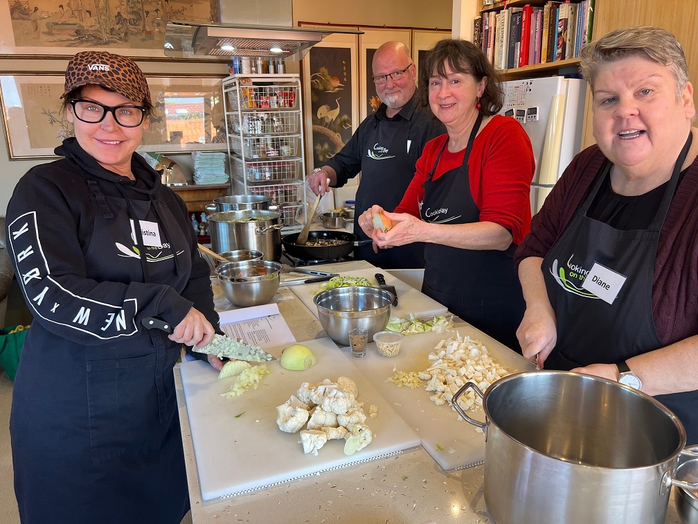 ‘The four-course meal we cooked was delicious; I had never made anything like these dishes before.  The roasted tomato soup was my favourite as it was full of flavour and nourishment. The best thing I learnt in the class was that a good stock takes time to make. If you don’t spend the time on making a good stock, then your soups and sauces will be missing their foundation…a wonderful experience. Tonya is just so lovely and welcoming.  The kitchen was easy to work in and the time just flew.  To share the meal we had prepared over a glass of wine was a perfect way to finish an amazing day’. Sue Hamblin, Port Melbourne, 20th October 2019