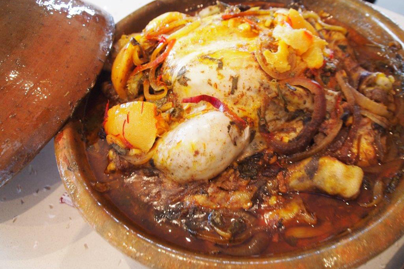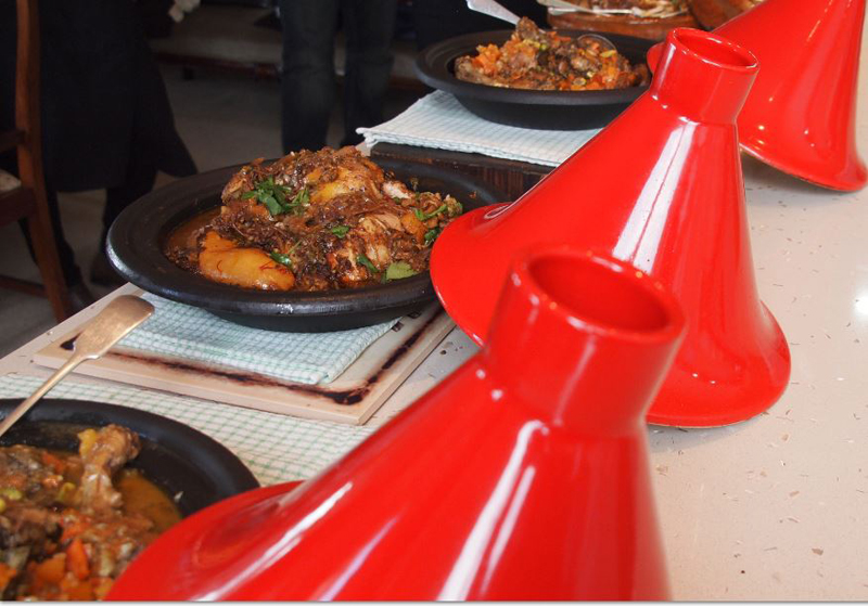 Dishes on the menu, vary with the seasons; dishes such as Moroccan Batbout, a flat bread eaten at every Moroccan meal, honey salted aubergines, Bessara, a Moroccan fava dip as well as a soup, cucumber and mint sorbet; pickled grapes; beetroot and orange spiced soup, served either hot or cold; Berber omelette tagine with Marrakesh meatballs; chermoula marinated aubergines; a variety of tagines, such as a chermoula duck, lamb, beef and vegetable tagines; couscous, famous B’Stilla, a spiced, sweet and savoury, layered pigeon or chicken pie; sardines butterflied with chermoula, oranges and spices; rosewater meringues with dates and almonds, saffron custards with cinnamon oranges.