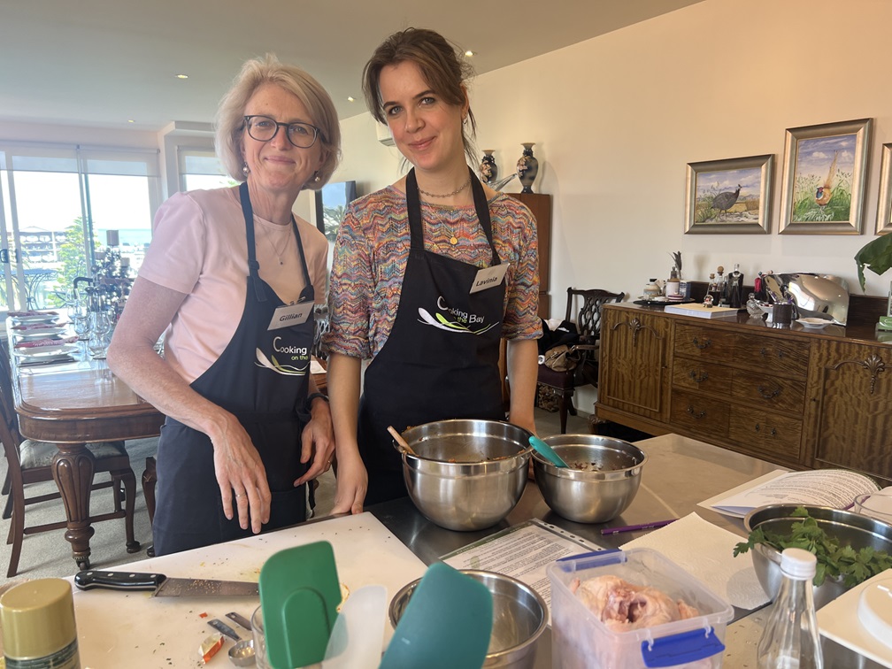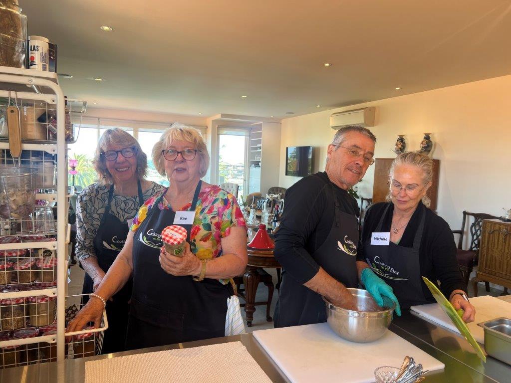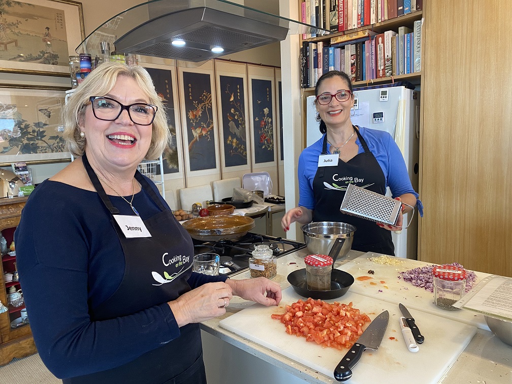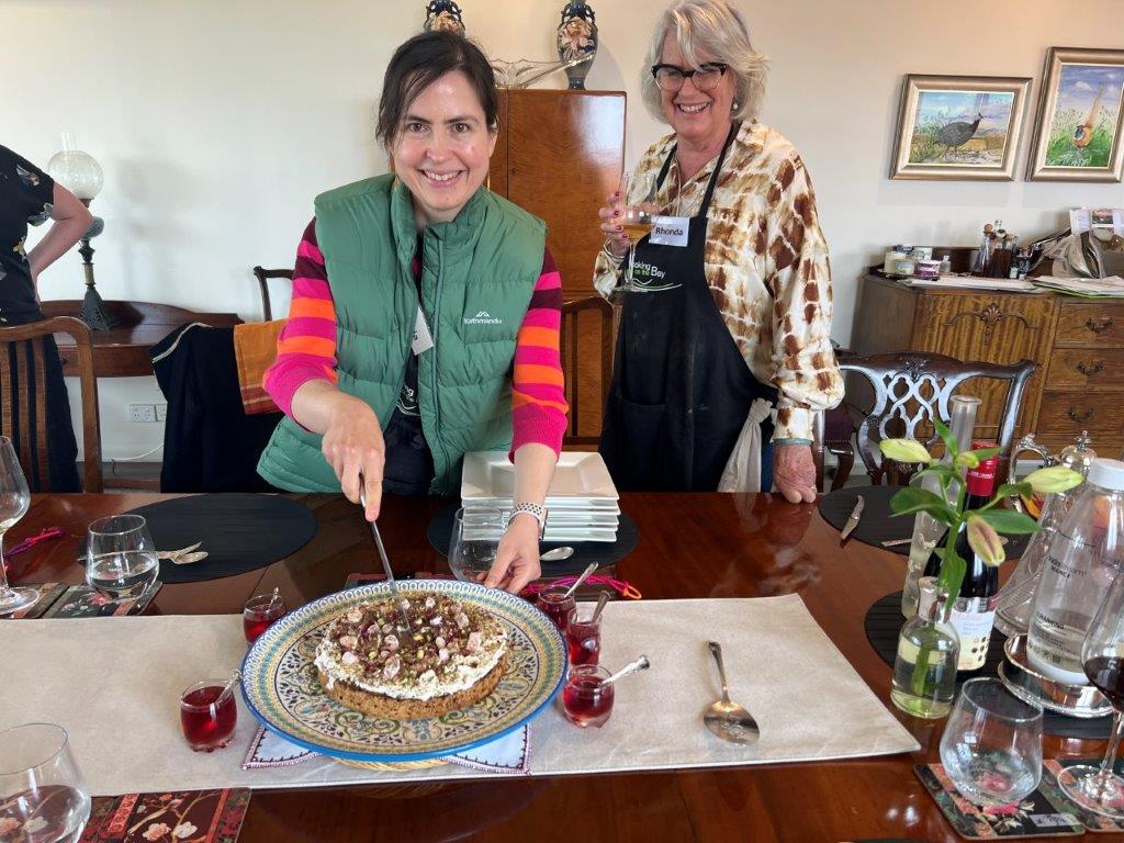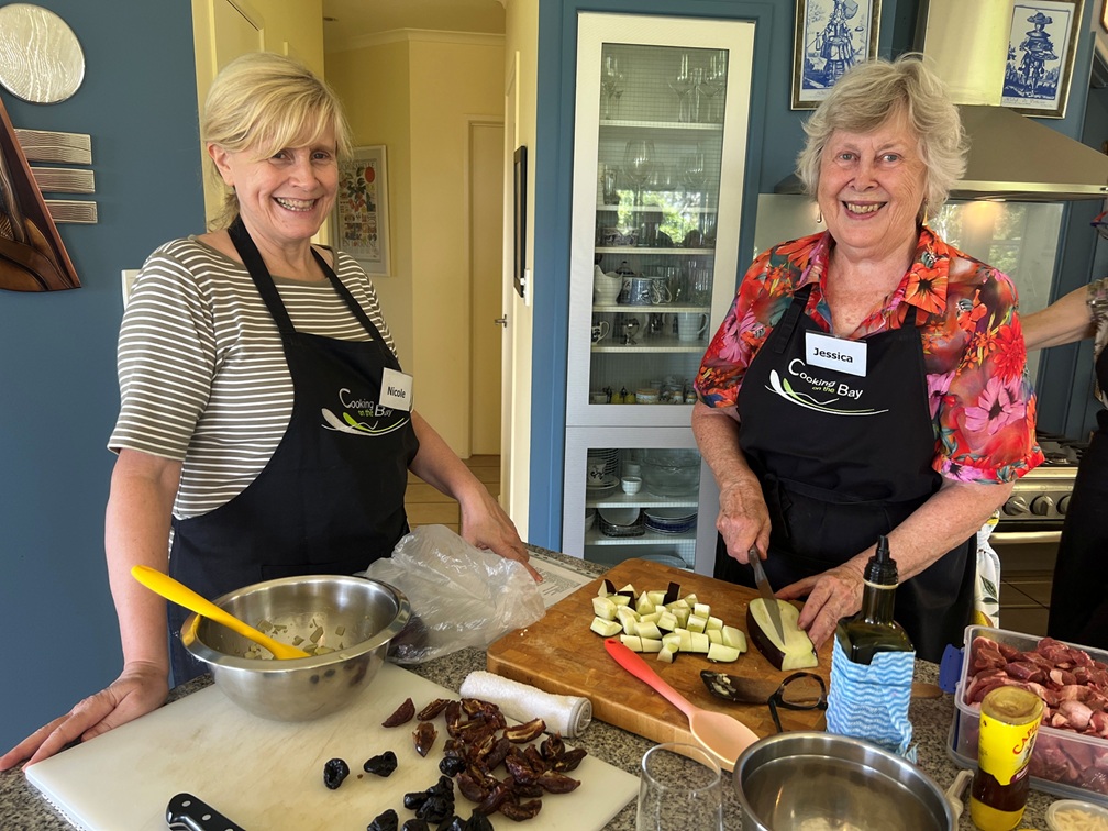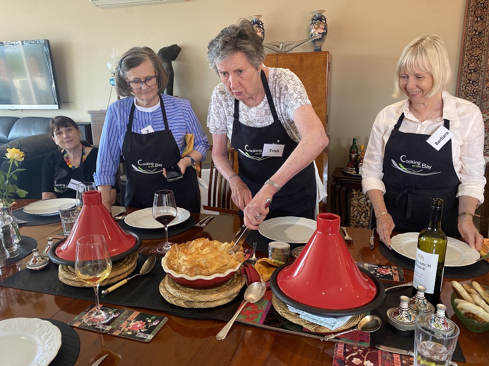 Rae Guerin and Lynelle Guerin `We have just enjoyed a great day at Cooking On The Bay doing Tonya’s Moroccan cooking class. The group made (with lots of help from Tonya) flat bread, bean dip, honey salted aubergines, Berbera omelette, B’stikla-Moroccan spiced chicken pie, Cranberry jelly and a Chocolate, date & almond torte.
