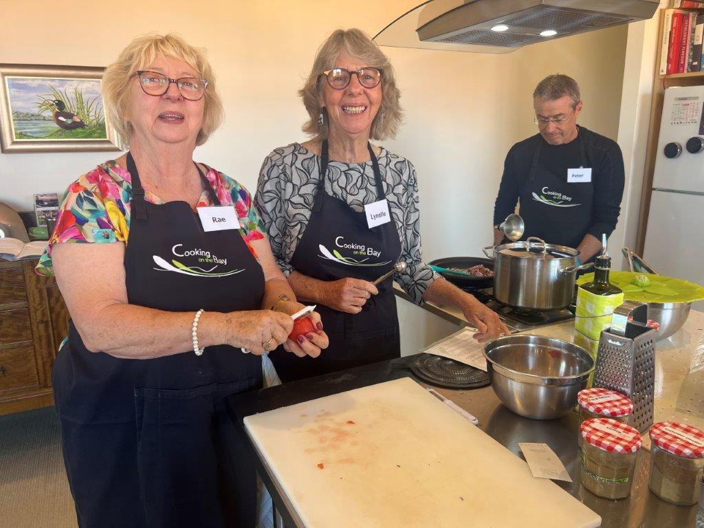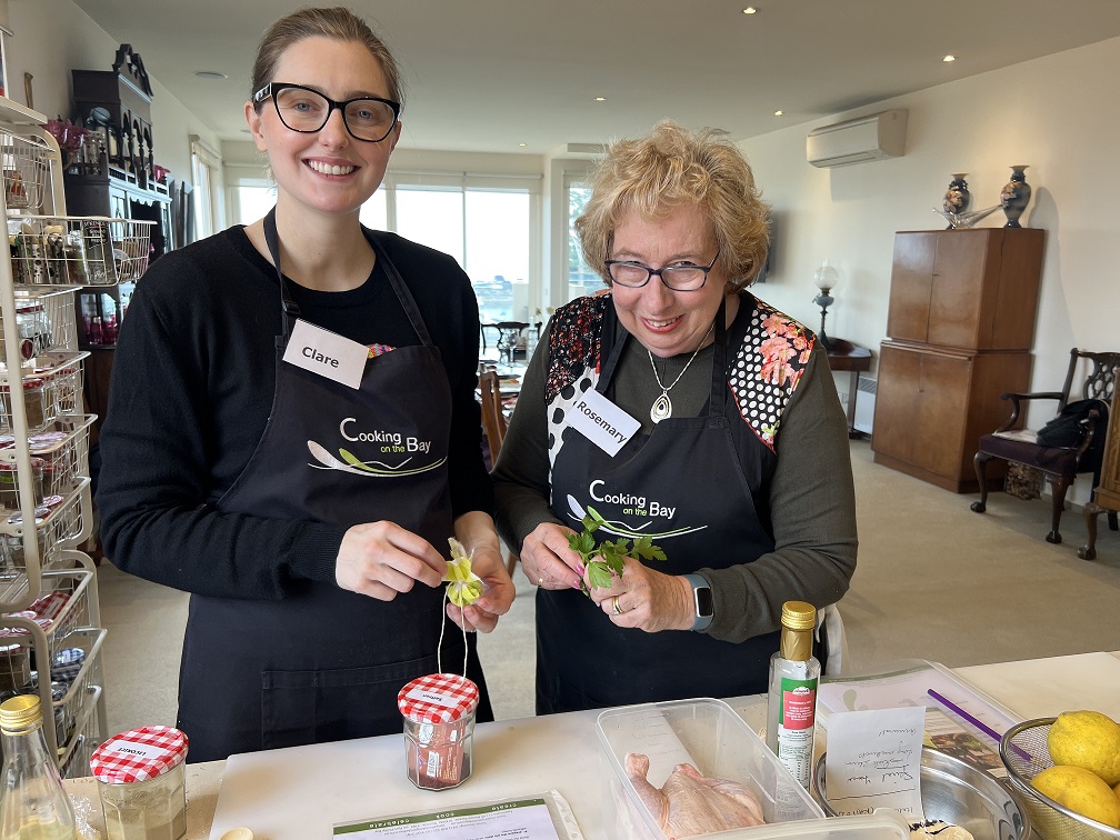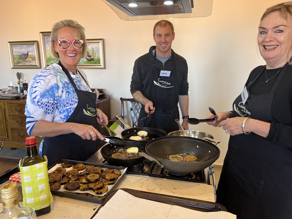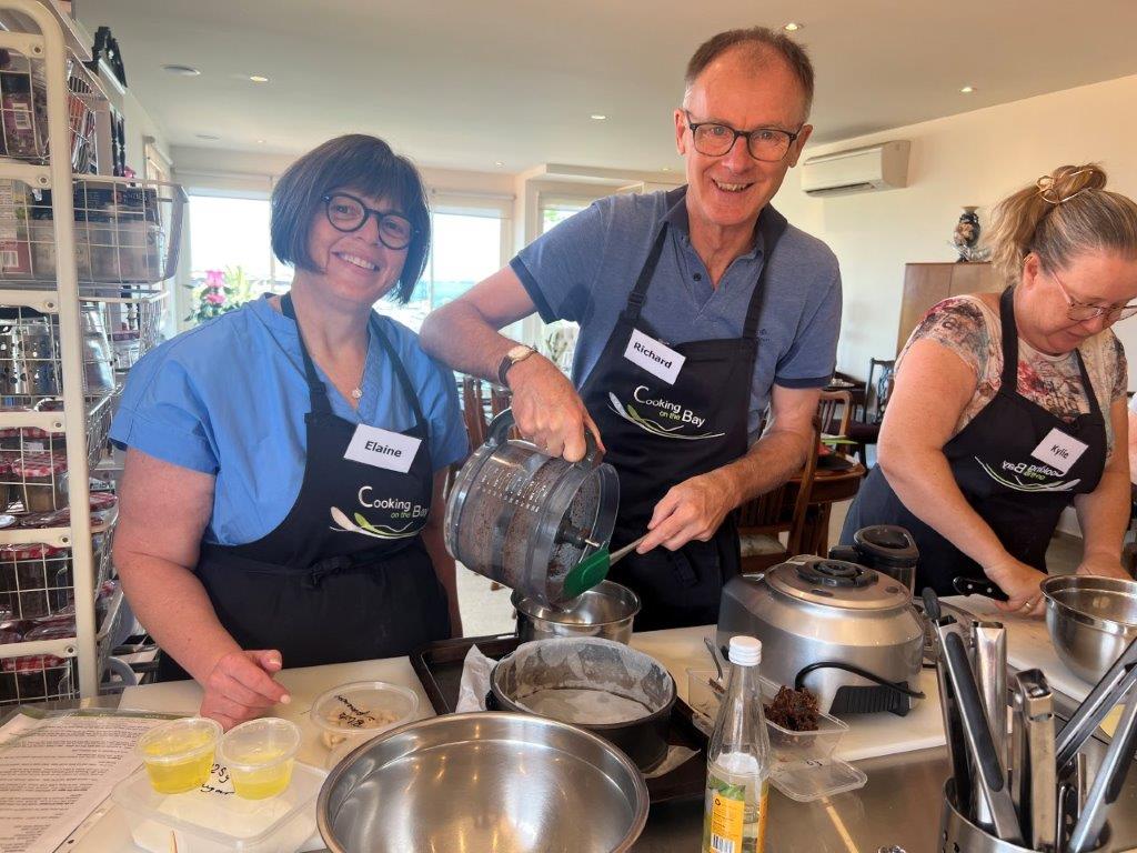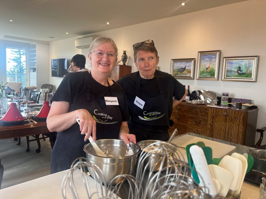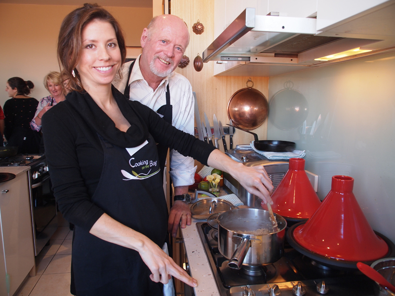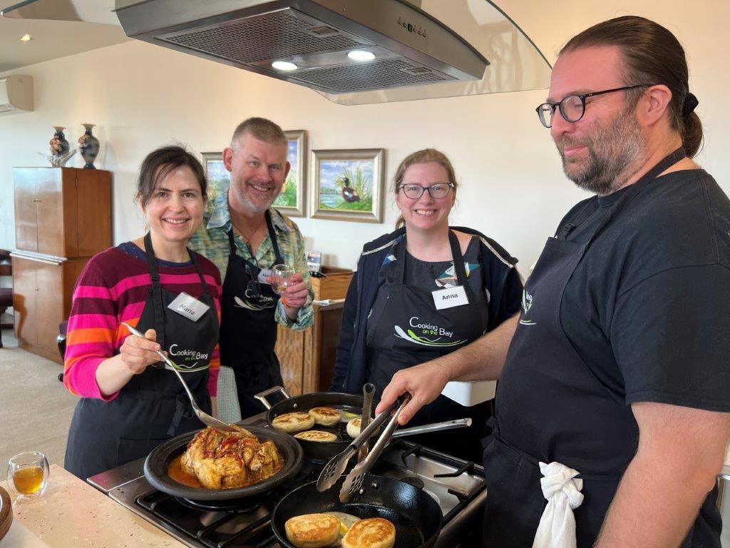 Rae Guerin and Lynelle Guerin `We have just enjoyed a great day at Cooking On The Bay doing Tonya’s Moroccan cooking class. The group made (with lots of help from Tonya) flat bread, bean dip, honey salted aubergines, Berbera omelette, B’stikla-Moroccan spiced chicken pie, Cranberry jelly and a Chocolate, date & almond torte.