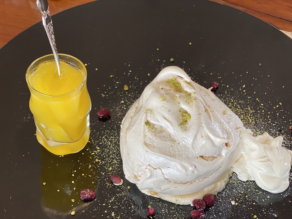 - Orange juice jelly and almond centred meringues with pistachio dust