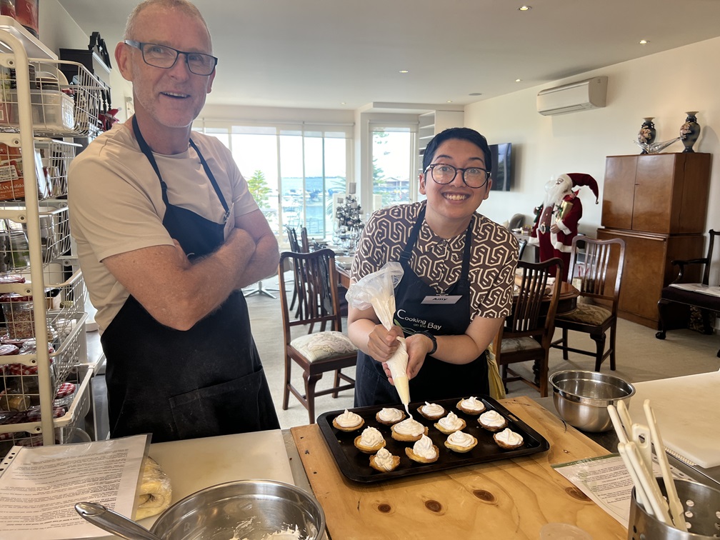 Dear Tonya, Thank you so much for a wonderful day in your home learning to improve my cooking skills. It was a wonderful experience and you obviously put enormous thought and effort into your sessions. You make the potentially difficult look easy. After all, you have the ‘know-how’, and I have come away from today’s class with renewed enthusiasm and confidence to ‘have a go’ at cooking tasks I have previously avoided due to lack of confidence. Perhaps I now know how to at least try my hand with the recipes (and puff pastry!!) we tried today? Thank you! Best wishes, Michael’. Michael Holmes, Burwood, Vic. French Desserts, Saturday 13th May, 2023