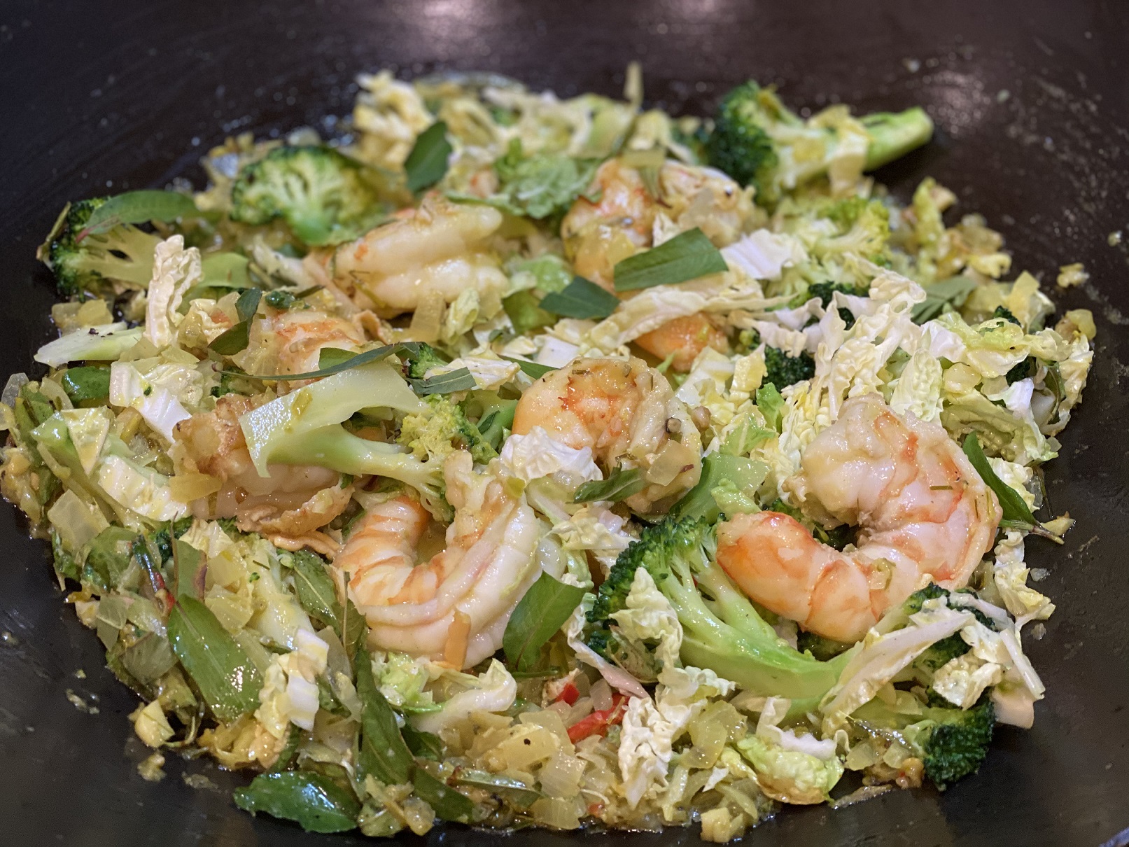 Add the broccoli florets and the finely shredded Chinese cabbage. Toss to combine and the cabbage has wilted.