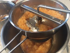 Step two: Remove from the heat and discard the muslin bag of peel. and process though a mouli, or food mill. This removes the seeds and cores and gives a good purée texture. Work as much of the quinces as you can through the mouli. Discard the small amount remaining in the sieve.