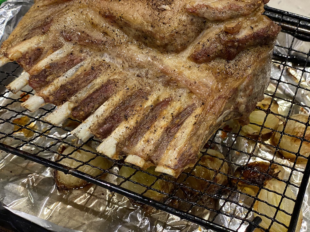 Place the rack on a wire roasting rack inside a roasting pan. I sometimes roast some oiled and seasoned vegetables, such as broccoli, Brussels sprouts, tomatoes, onions, under the rack and roast them at the same time.