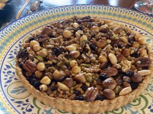 Our food the group cooked in this Moroccan class w Our food the group cooked in this Moroccan class was fabulous, well seasoned, as they tasted, adjusted, tasted again…. this call made it a delectable feast with superb Moroccan flavours of sweet and sour tantalising our tastebuds. The 2 chermoula duck tagines with duck, onions, apricots, olives, pomegranate seeds, pistachios, olives and more is in the blue and terracotta lids in the photos; they were so flavourful …and the lamb tagine with its deep caramelisation of the meat, aubergines, onions, prunes, dates and almonds with Ras el hanout and more spices… was fabulous … accompanied by  pearl couscous with preserved lemons, currants and almonds, Moroccan batbout flatbread and sides of aubergine petals, beetroot and cinnamon and allspice dip, harissa chilli paste, cumin labneh, and one of my favourites, honeyed and salted aubergines was heavenly although this dish take ages  to shallow fry!! …. And for dessert.. a nectarine, figs not quite in season yet, so a nectarine, almond and frangipane galette and rosewater meringues and orange juice infused dates and almonds buried inside the meringues…. A perfect day of cooking, feasting and relaxing over lunch with a group of old and new friends #cookingonthebayatkureelpa #cookingfabulously #cookingonthebaycookingclasses #cookingmoroccanfood #moroccancookingclasses