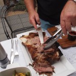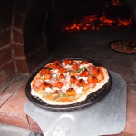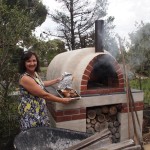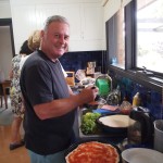 What a great experience. John is the expert at the pizza; he made a delicious pizza dough, thin and crisp, and topped the pizzas with his homemade tomato passata, home grown tiny tomatoes, basil, prosciutto, mozzarella and aubergine. Pizzas were followed by a slow cooked leg of lamb with garlic and rosemary, baked potatoes, cooked in the pizza oven, of course, accompanied by fresh salads made by Cheryl, and all made with the produce from their garden – it was a taste sensation. And we were sent home with bags of freshly cut herbs, salad greens, capsicum and cucumbers.
