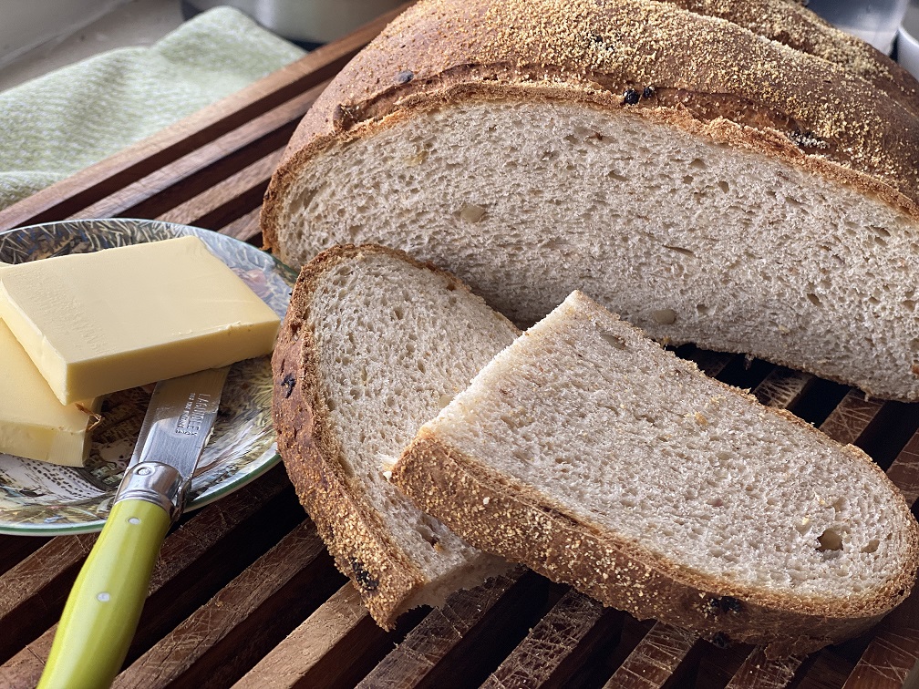I often bake this bread for the French Odyssey – Journey through France cooking classes, especially if we are making the walnut and Roquefort cheese terrine. Walnuts are grown widely in SW France, and when I was in the Dordogne with various culinary tours we always took the group to an ancient walnut mill and watched the making of their delicious and prized walnut oil. This versatile bread is served either fresh or toasted and is a wonderful accompaniment to cheese and wine, and to my walnut and Roquefort cheese terrine.